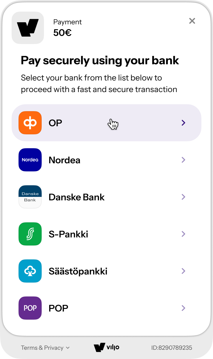 There’s nothing to set up: no registration, no app downloads. All you need is your online banking credentials. Just choose Viljo as payment method at checkout, and you’re good to go.